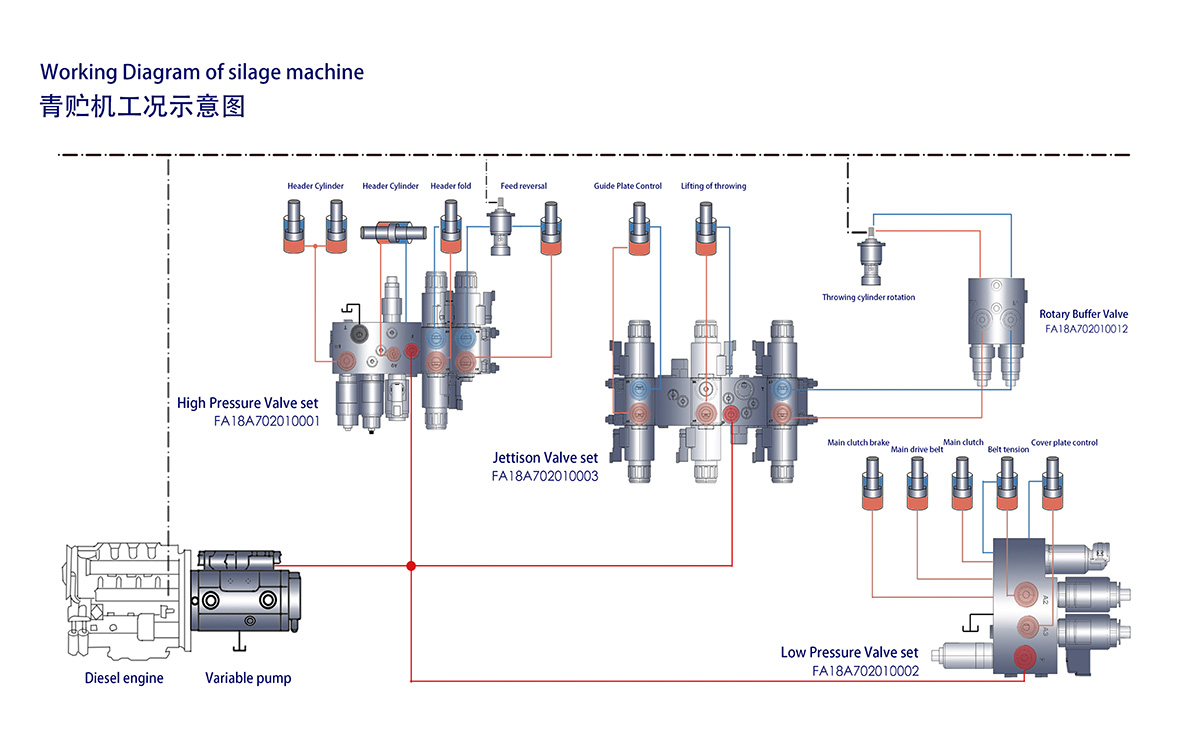 1、根據(jù)青儲機作業(yè)工況,首次提出細分行走驅(qū)動模式--路面轉(zhuǎn)場和作業(yè)模式。在作業(yè)模式時,發(fā)動機轉(zhuǎn)速降至1900rpm,行走閉式泵工作在小排量;在路面轉(zhuǎn)場模式時,發(fā)動機轉(zhuǎn)速降至1200rpm,行走閉式泵工作在大排量下,極大的降低了噪音和油耗。
